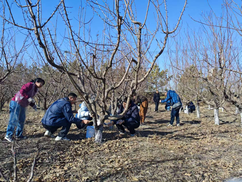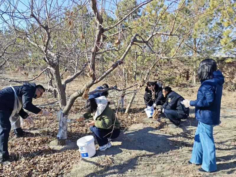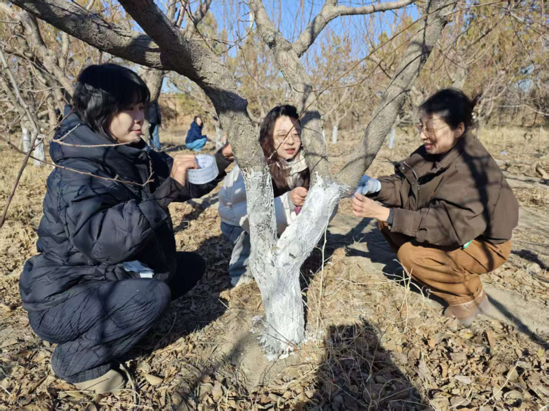 活动现场,党员骨干充分发挥先锋模范作用,以守护林果产业安全、服务基层为己任,切实筑牢春季果树病虫防控第一道防线,以实际行动践行正确政绩观。包头市农科院第二、三党支部精心组织党员技术骨干深入田间果园,扎实开展春季果树管护专项行动,植保植检中心全程提供专业技术指导。党员干部带头示范、率先实操,现场开展树干涂白、拆除越冬胶带、缠绕新型防虫胶带等关键作业,细致清理树干老翘皮、虫卵及杂物,规范涂抹涂白剂,彻底清除胶带残留虫源;围绕涂白剂科学配比、树干防护要点、病虫源头治理等关键环节开展实操教学,手把手传授管护技巧、面对面解读技术规范,以学促干、以干提能,全面提升果树管护技术水平,为全市林果提质增效、春耕生产安全有序推进保驾护航。