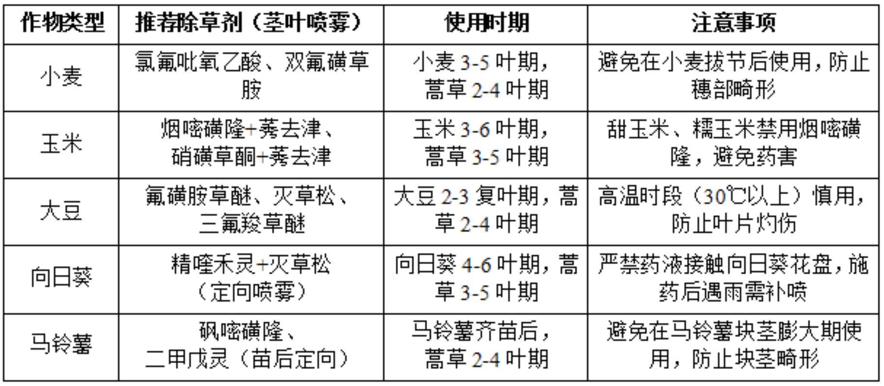 3. 化学防治(针对性选药)。根据作物类型选择安全除草剂,避免药害,具体如下表: