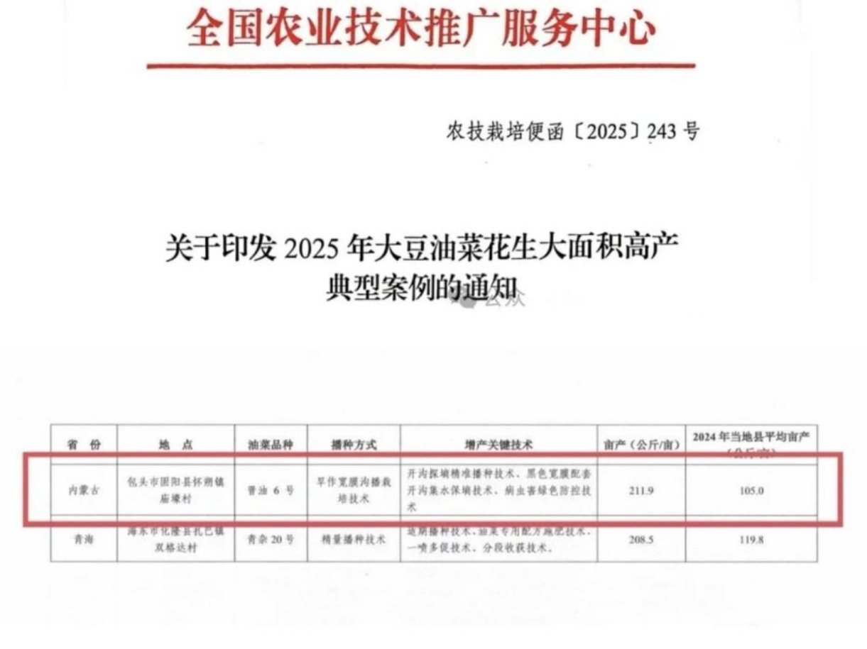 近日,全国农业技术推广服务中心正式印发《2025年大豆油菜花生大面积高产典型案例》,固阳县怀朔镇庙壕村“油菜宽膜沟播集成技术模式”成功入选,成为阴山北麓冷凉干旱地区粮油作物单产提升的标杆范例,标志着我县在旱作农业技术创新与推广领域取得国家级认可,为同类生态区域农业发展提供了可复制、可推广的“固阳方案”。