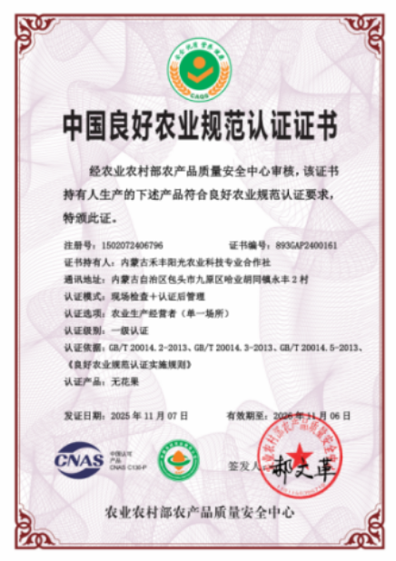 今年以来,我市先后有4家企业凭借严苛的生产标准、过硬的产品品质成功通过良好农业规范(GAP)认证审核,取得农业农村部农产品质量安全中心颁发的中国良好农业规范认证证书,超额完成本年度GAP认证目标。其中包头市久元牧业有限公司和固阳县蒙芪王农民专业合作社两家企业实现新认证突破,内蒙古禾丰阳光农业科技专业合作社和内蒙古天宇牧歌农牧业科技发展有限公司两家企业顺利通过再认证复核,认证产品分别为奶牛、黄芪、无花果和肉用羊,此次四家企业认证成功,不仅是企业自身的荣誉,更反映了包头市在推进农业标准化、产业化方面的显著成效。