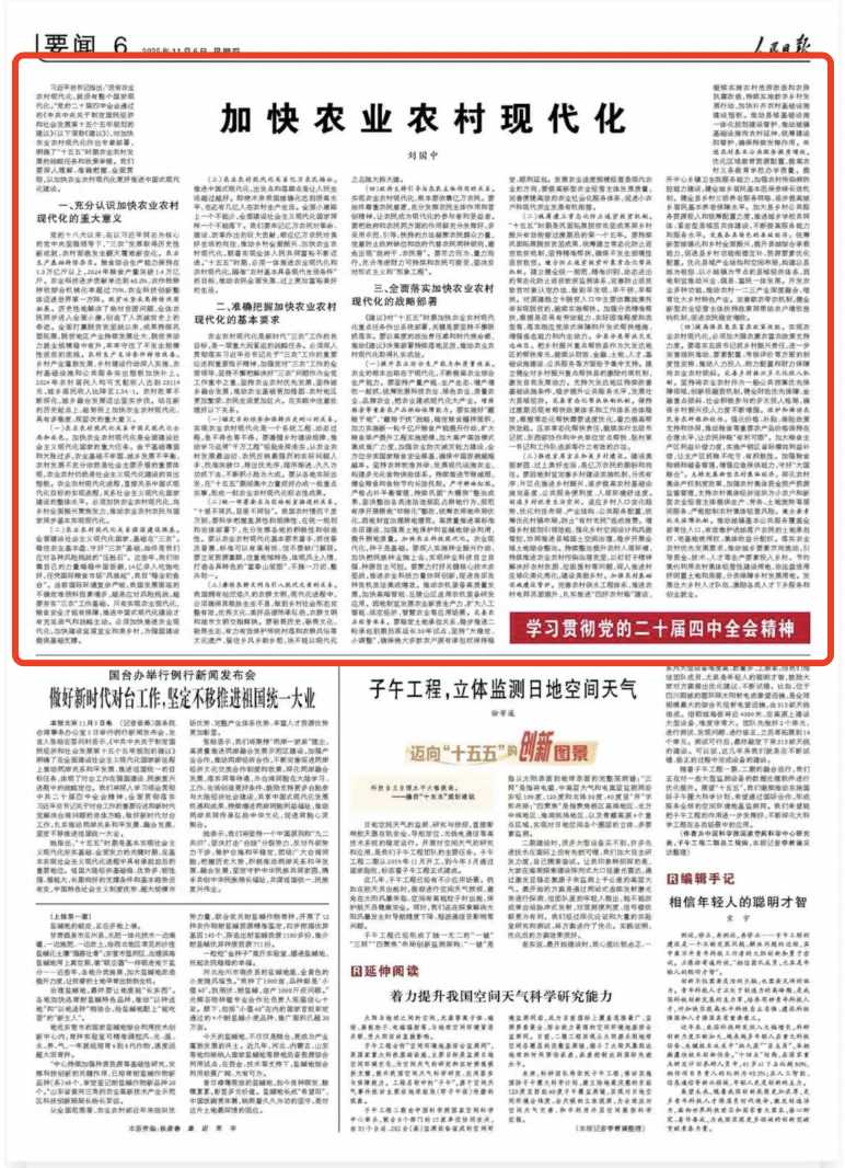 11月6日,《人民日报》要闻版刊发中共中央政治局委员、国务院副总理刘国中的署名文章《加快农业农村现代化》。