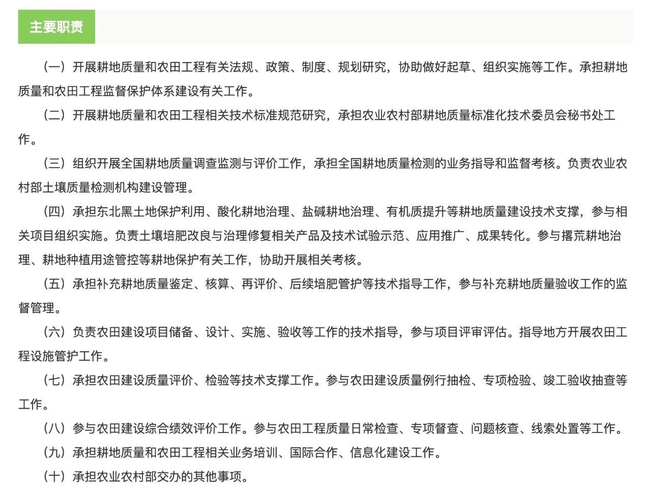 随着农田中心同步亮相的,还有其主要职责与内设机构。其核心职责包括耕地质量和农田工程的技术指导、监督保护体系建设及监督考核等。下设的13个处室中,除办公室、技术标准处、体系建设处、耕地质量监测检测处、耕地质量评价保护处外,还包括农田建设验收评价处、农田工程质量检验处、农田工程质量监督处等。