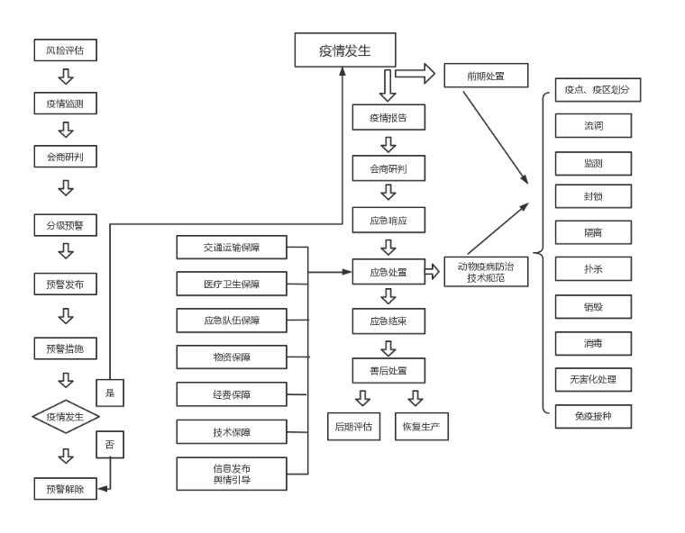在发生疑似疫情时,事发地指挥部进行前期处置,根据流行病学调查结果,分析疫源及其可能扩散流行风险等情况。在对疑似疫情报告的同时,对发病场户实施隔离、监控,禁止动物及其产品、饲料及相关物品移动,在采样后进行严格消毒等临时处置措施,限制人员流动。对可能存在的传染源,以及在疫病潜伏期和发病期间售出的动物及其产品、被污染或疑似污染的物品(包括粪便、垫料、饲料等),立即开展追踪调查,并按照规定进行彻底消毒和无害化处理。必要时,可以采取封锁、扑杀等措施。